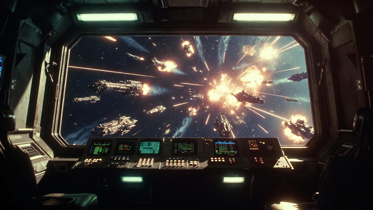 A futuristic spaceship cockpit features control panels, screens, and seats in the foreground. A large viewport displays an intense space battle with numerous warships exploding amid laser fire and debris. Neon green lighting illuminates the high-tech interior.