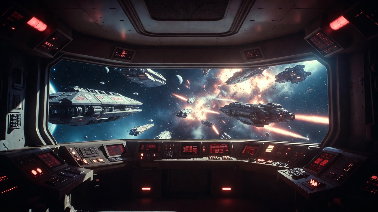 A spaceship cockpit features a wide viewport displaying an intense space battle with multiple starships firing lasers and explosions. The control panels and consoles glow red with numerous buttons and screens. Stars and debris fill the cosmic background outside the window.