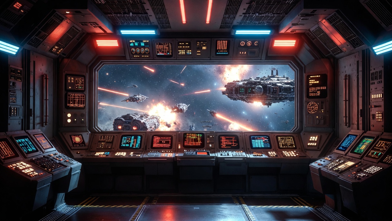 A futuristic spaceship bridge features multiple glowing control panels, screens, and consoles with red and blue neon lights. A large viewport displays an intense space battle with exploding starships, laser fire, and debris against a starry background. The interior has a high-tech, metallic design with illuminated edges.