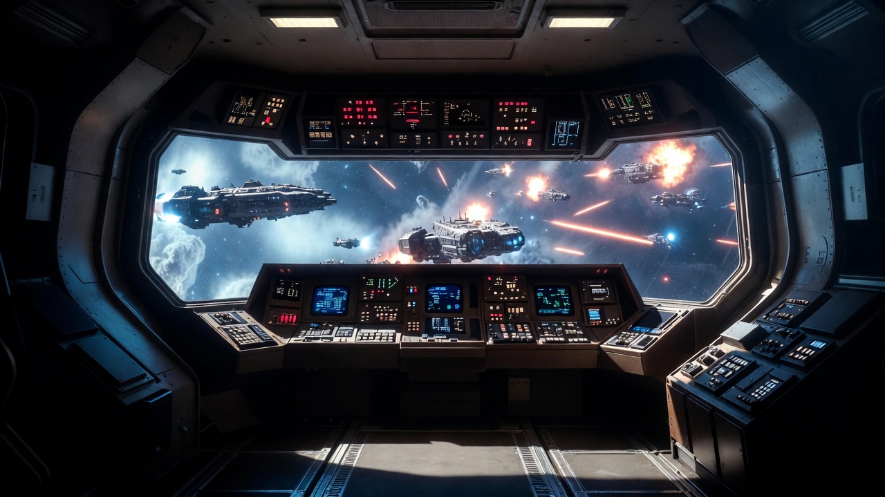 A futuristic spaceship cockpit features glowing control panels and a wide viewport. Through the window, multiple starships engage in an intense space battle with laser fire and explosions. The scene is viewed from the pilot's perspective with no people visible.