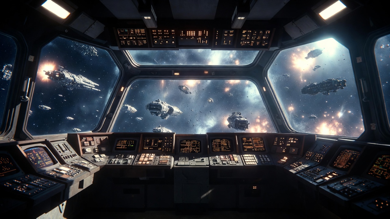 A futuristic spaceship bridge features multiple control panels and glowing screens. A large panoramic window displays a chaotic space battle with numerous starships exploding amid stars and debris. The interior is lit by overhead lights and console glows against the dark cosmic backdrop.