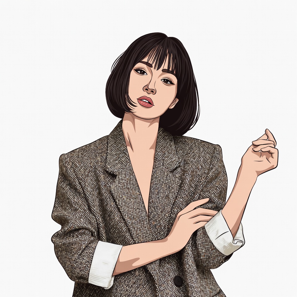 An illustrated Asian woman with straight black bob haircut and bangs poses confidently. She wears a brown tweed blazer with a deep V-neckline and white shirt collar, standing against a white background. Her hands are raised gracefully near her face.