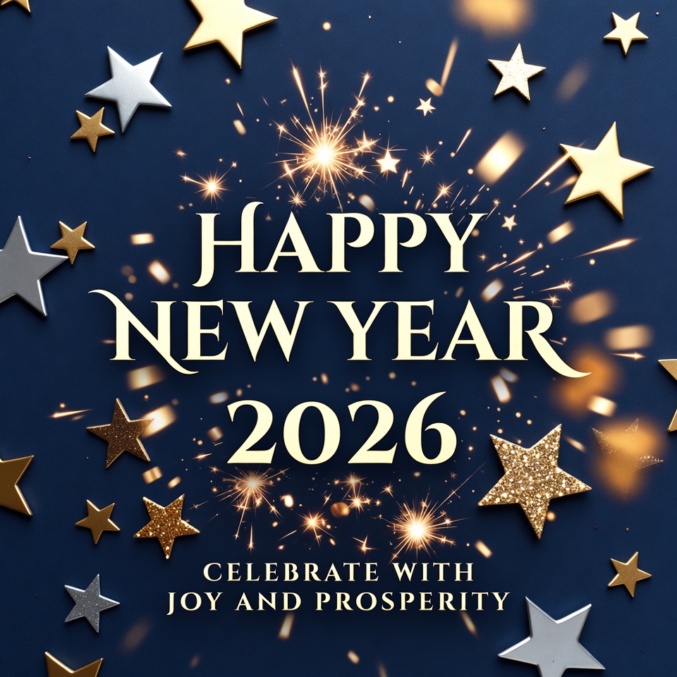 celebration text, dark blue background, festive graphic, festive stars, fireworks, gold foil, golden stars, holiday design, joy prosperity, new beginnings, new year 2026, new year greeting, new year illustration, party graphic, shiny stars, silver foil, silver stars, sparkling bursts, sparkling effects, year 2026, happy new year