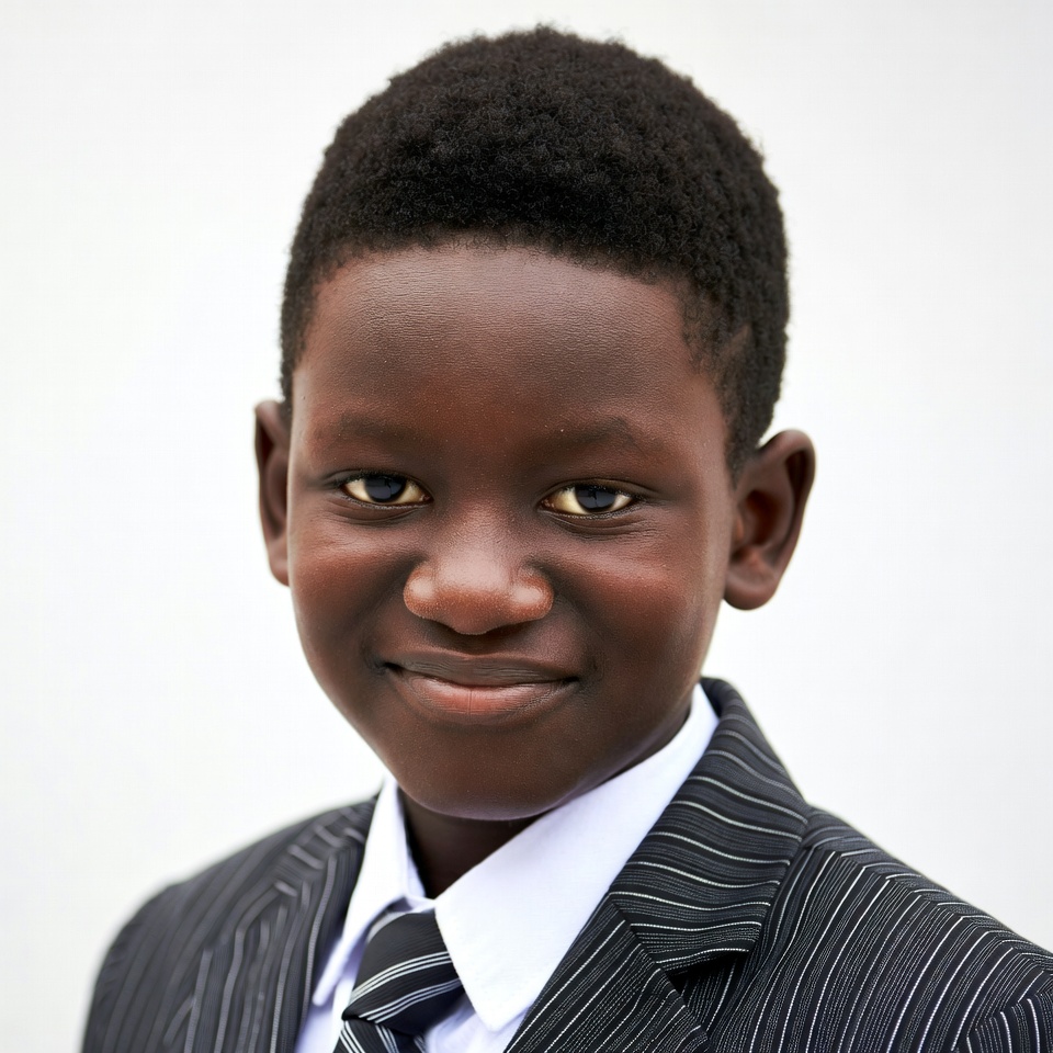 A young African boy with short curly black hair smiles at the camera against a white background. He wears a black pinstripe suit jacket, white dress shirt, and black tie. His expression is cheerful with bright eyes and a slight grin.
