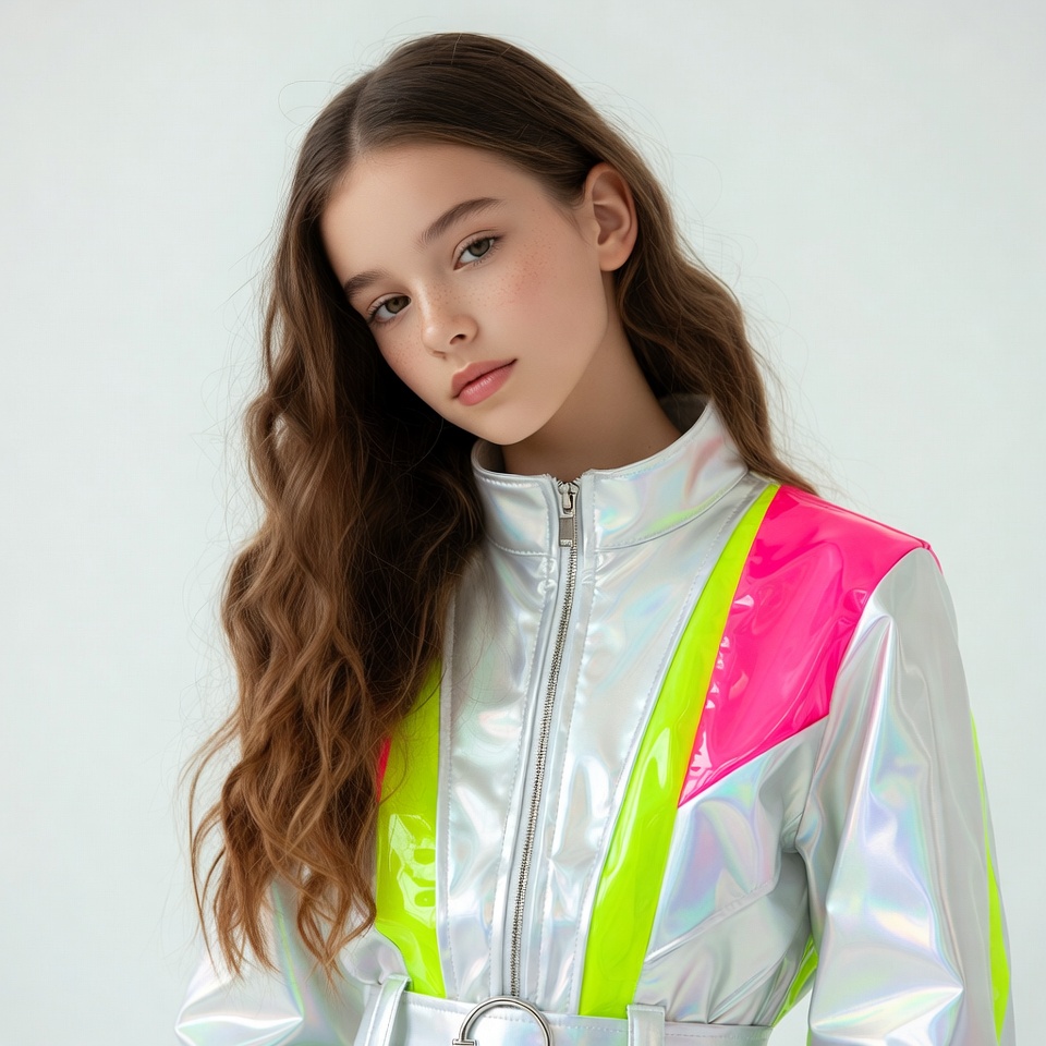A young girl with long wavy brown hair stands against a white background. She wears a shiny metallic silver jumpsuit with pink and green stripes and a zipper. She looks directly at the camera with a subtle expression.