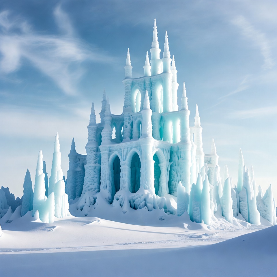 A tall, intricately carved ice castle stands majestically on a snowy plain. The structure features multiple spires, arched windows, and turquoise-hued ice walls under a cloudy blue sky. Surrounding icicles and snow enhance its frozen grandeur.