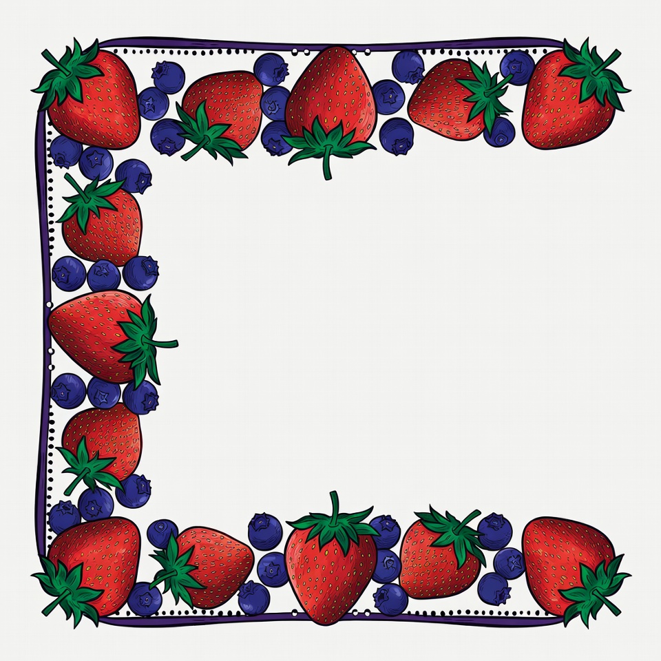 berry border, blueberries, blueberry, border, clipart, frame, fruit, fruits, green leaves, illustration, isolated background, purple outline, red strawberries, square border, strawberries, strawberry