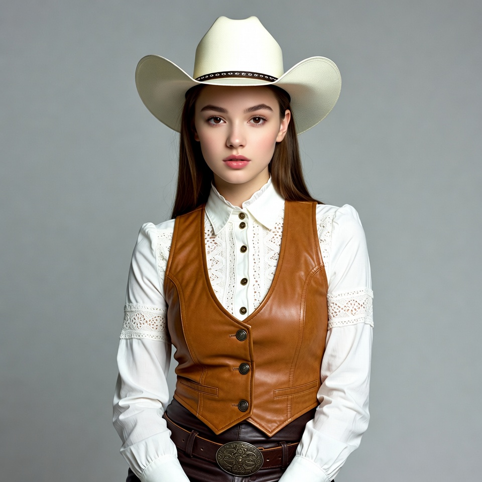 A young woman with long straight brown hair stands against a gray background wearing a white cowboy hat. She has a white collared blouse with lace details under a brown leather vest and a wide brown leather belt. Her expression is neutral with direct gaze at the viewer.