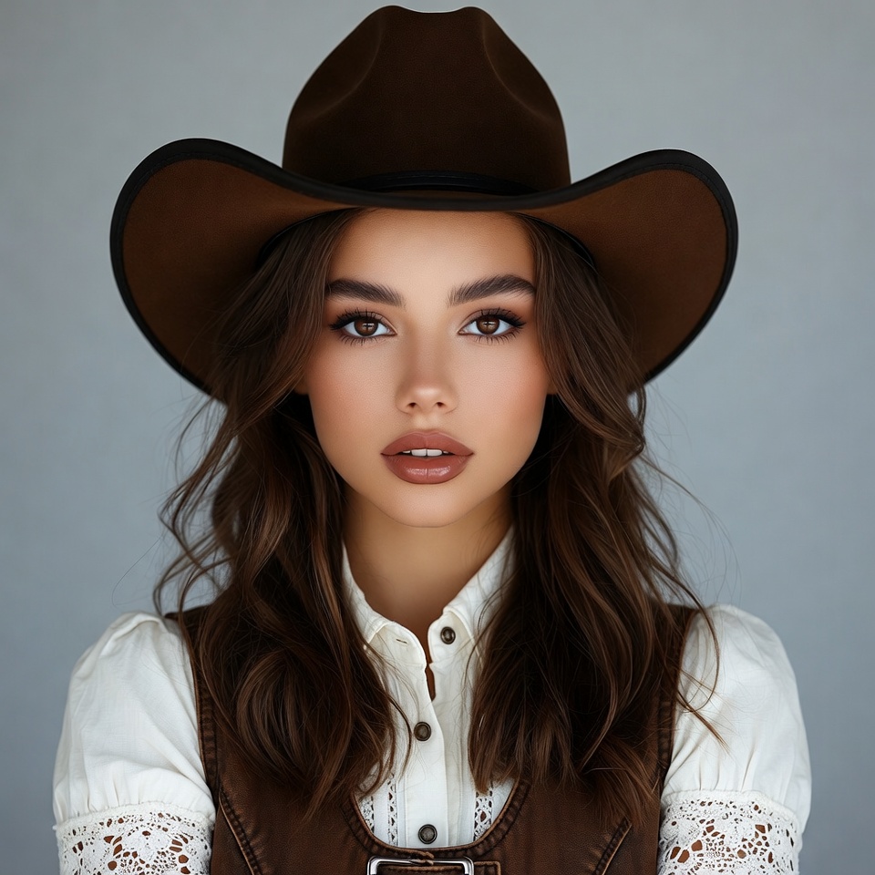 A young woman with long wavy brown hair and striking makeup poses confidently against a plain gray background. She wears a wide-brimmed brown cowboy hat, a white collared blouse with lace details, and a brown leather vest. Her lips are painted in a bold pink shade, and she gazes directly at the camera.