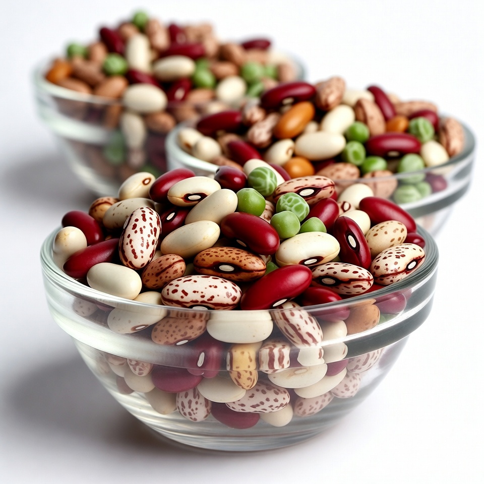 Three clear glass bowls filled with a colorful assortment of beans sit on a white background. The beans include red kidney beans, white beans, green beans, pinto beans, and black beans. They are arranged in overflowing piles, showcasing various shapes, sizes, and colors.