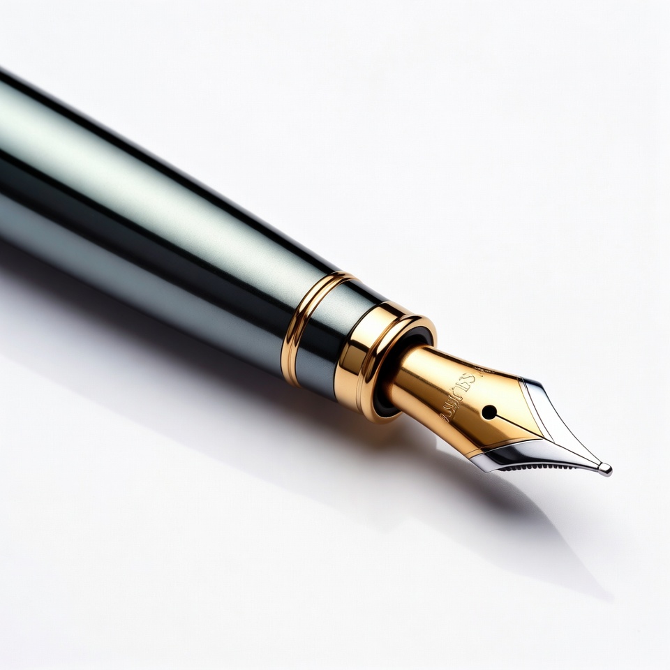 elegant pen, gold accents, gold nib, gray barrel, ink pen, isolated background, luxury pen, metallic pen, office supply, pen closeup, precision nib, shiny pen, writing instrument, writing tool, fountain pen