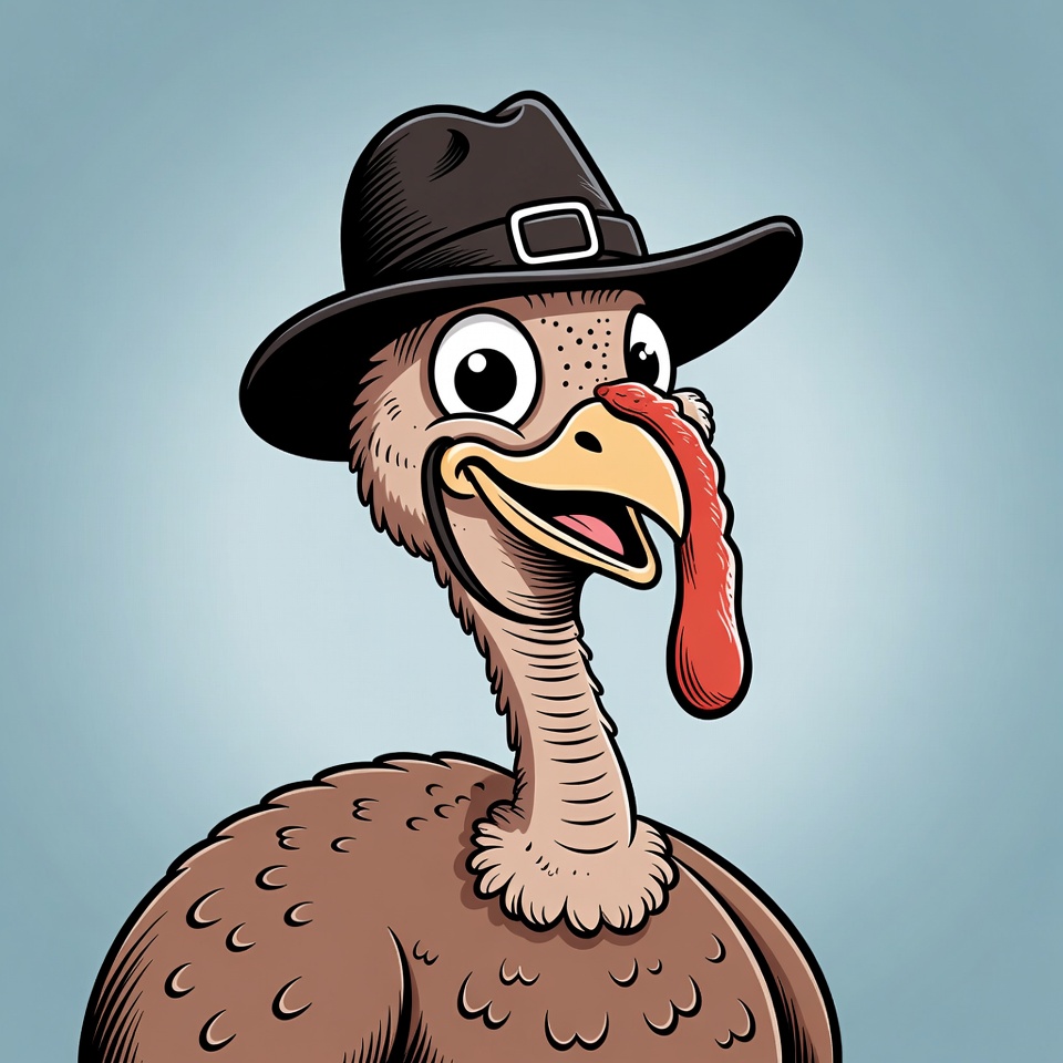Thanksgiving turkey, animal, anthropomorphic turkey, big eyes, bird, black hat, cartoon turkey, clipart, cowboy hat, feathers, funny turkey, illustration, isolated background, smiling turkey, wattle, turkey