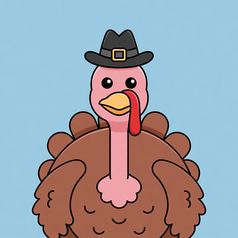 A cute cartoon turkey with big pink eyes and a bright orange beak stands on a blue background. It wears a black cowboy hat with a buckle and has brown feathers with pink accents on its head and neck. The illustration features a red wattle and fluffy brown tail feathers.