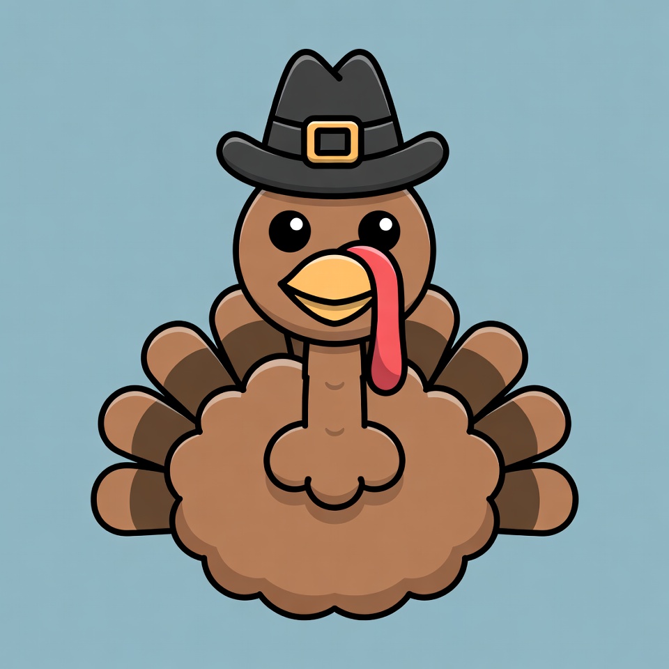 A cute cartoon turkey with big eyes stands on a blue background. It wears a black pilgrim hat with a gold buckle and has a red wattle and beak. The turkey features brown feathers and fanned tail.