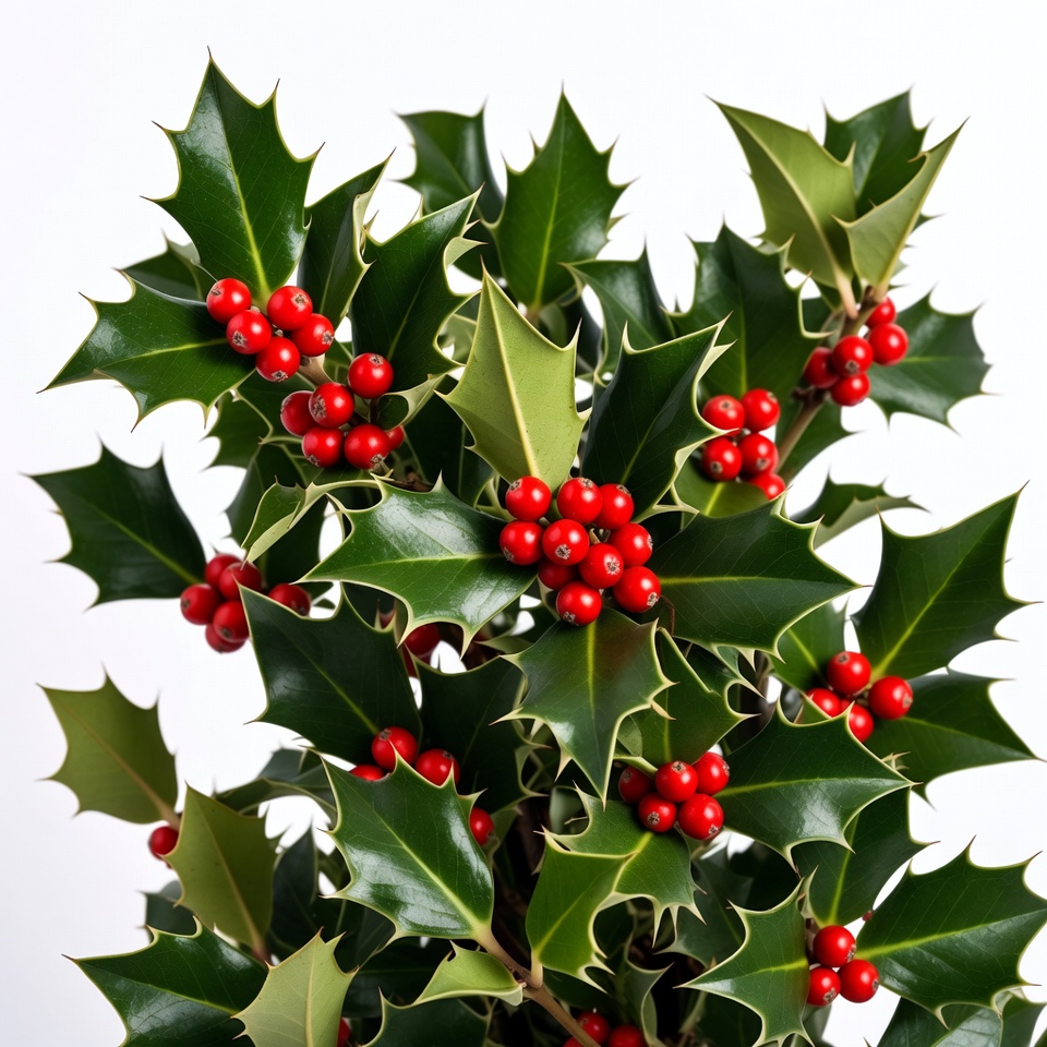 Vibrant green holly leaves with spiky edges and clusters of bright red berries are arranged prominently. The plant is photographed against a clean white background, highlighting its glossy foliage and colorful berries. Several berry clusters are visible throughout the branches.
