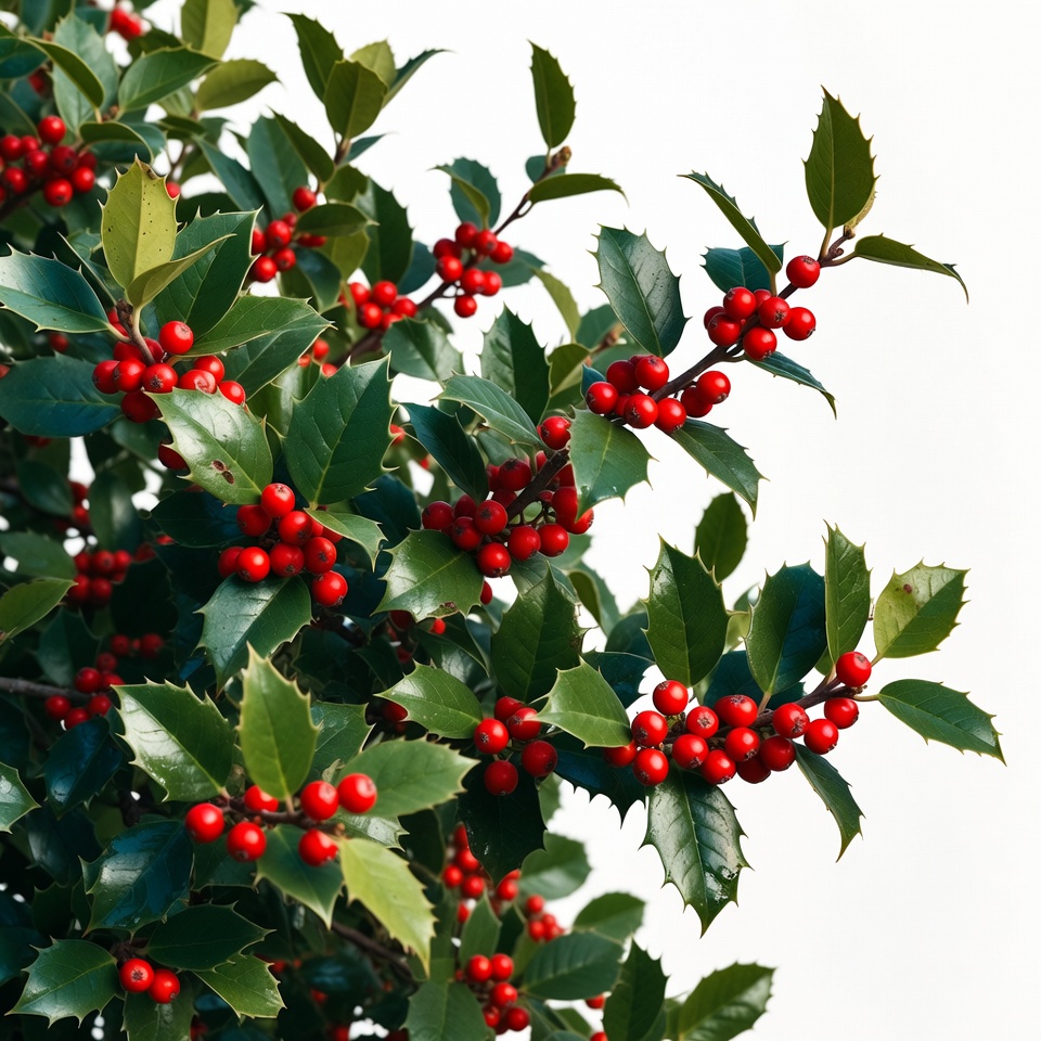 Christmas, berries, botanical, branches, decoration, evergreen, festive, foliage, glossy leaves, green leaves, holiday, isolated background, leaves, nature, plant, red berries, vibrant red, white background, winter, holly