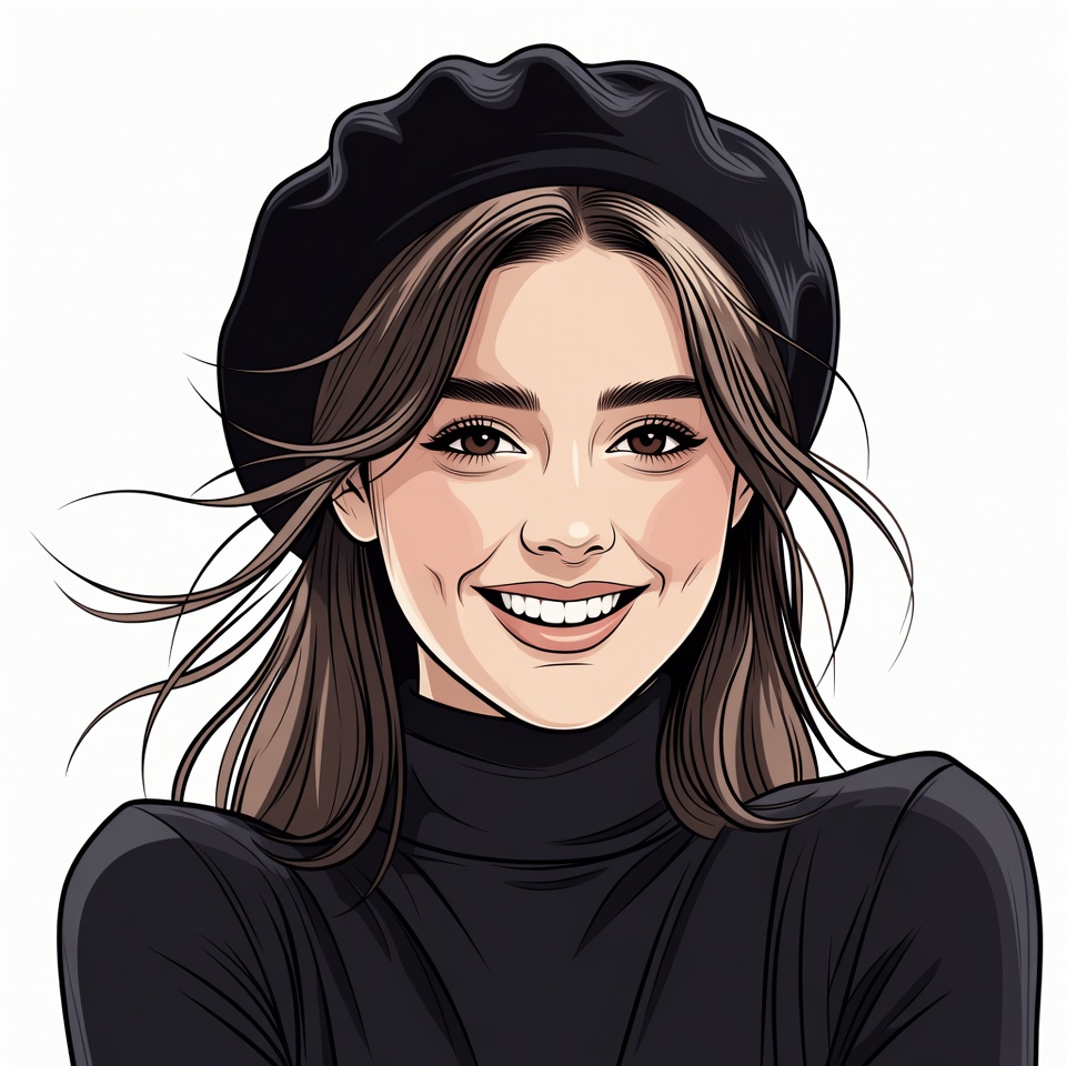 A young woman with long wavy brown hair smiles happily while wearing a black beret and black turtleneck sweater. Her face is detailed in an illustration style with flushed cheeks and expressive eyes. She is centered against a plain white background.
