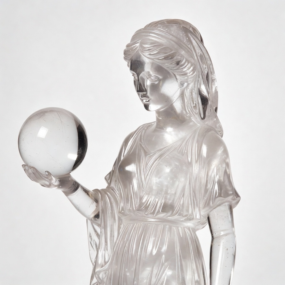 classical statue, crystal ball, draped gown, elegant figure, female figure, fortune teller, glass woman, greek statue, holding orb, isolated background, long hair, mystical sculpture, sculpture, translucent crystal, white background, woman statue, crystal statue