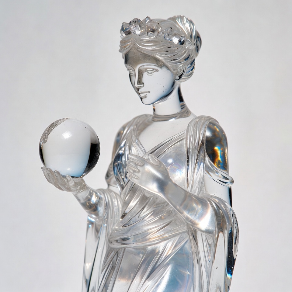 ancient style, art, classical woman, clear material, draped gown, elegant statue, female figure, floral crown, glass sculpture, holding globe, isolated background, prismatic glass, sculpture, statue, translucent crystal, white background, white globe, woman statue, crystal statue