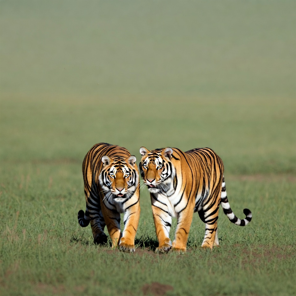 Two orange tigers with black stripes stand and walk side by side on a green grassy field. They face forward with intense expressions, their tails curved behind them. The background is a blurred green expanse under natural light.