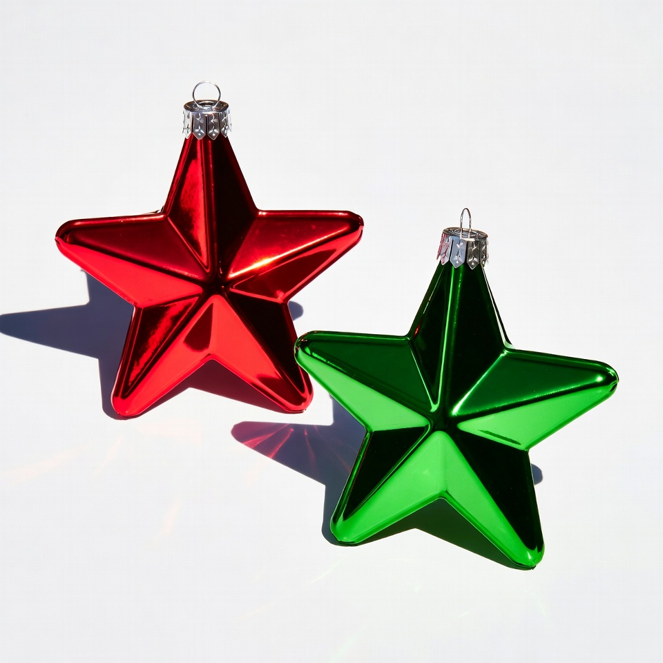 Christmas decor, Christmas stars, festive stars, glossy finish, green ornament, green star, hanging ornaments, holiday decorations, metallic stars, ornaments isolated, red ornament, red star, shiny ornaments, star ornaments, white background, Christmas ornaments