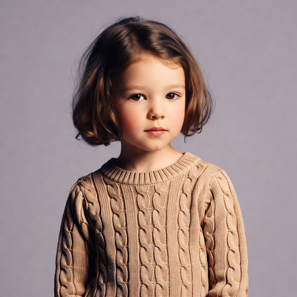 White, beige sweater, bob haircut, brown hair, cable knit, child, crew neck, cute girl, female, gray background, isolated background, portrait, toddler girl, wavy hair, young girl, girl