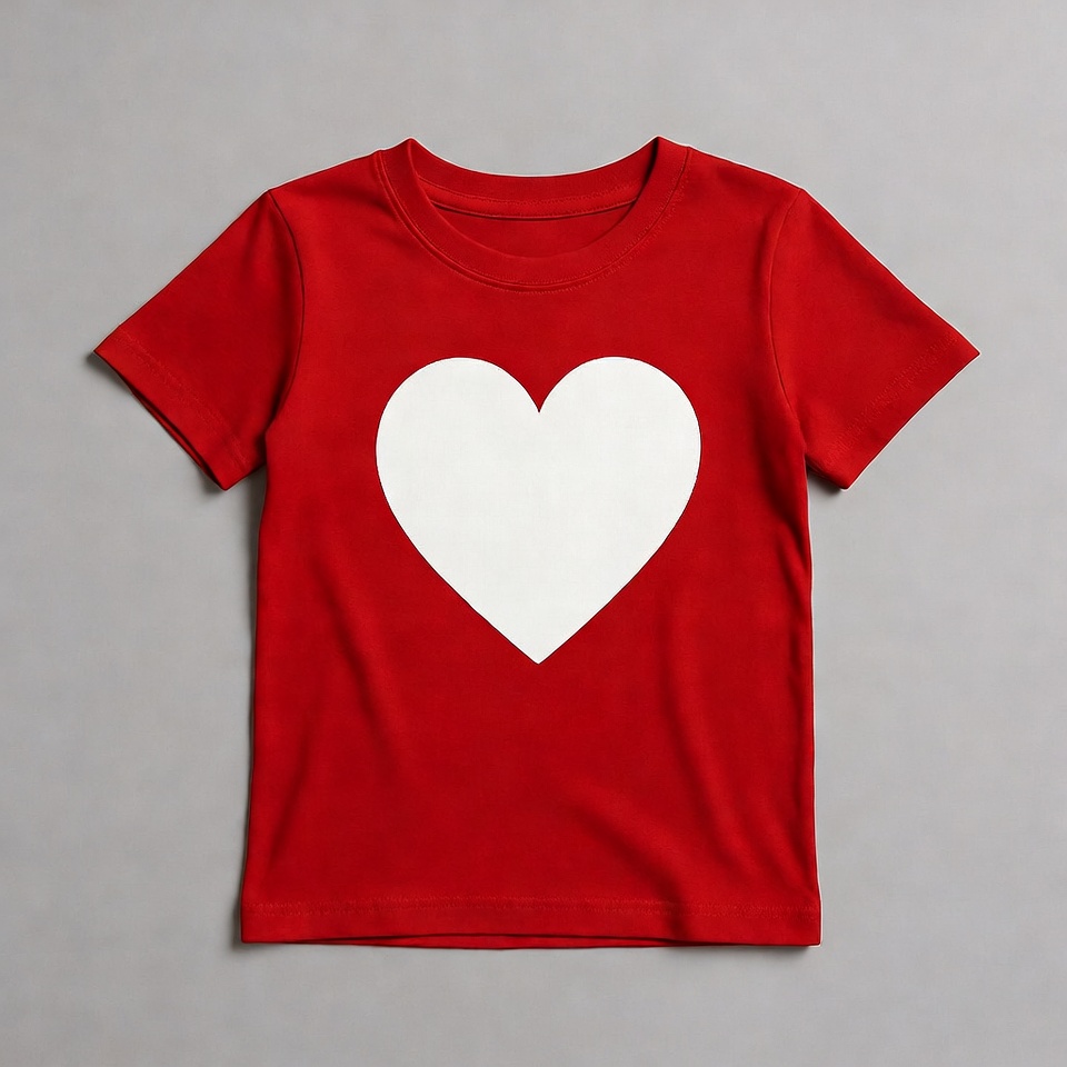 apparel, childrens clothing, clothing mockup, crew neck, graphic tee, heart design, isolated background, kids t-shirt, love symbol, short sleeve, simple design, toddler shirt, valentines shirt, white heart, red t-shirt