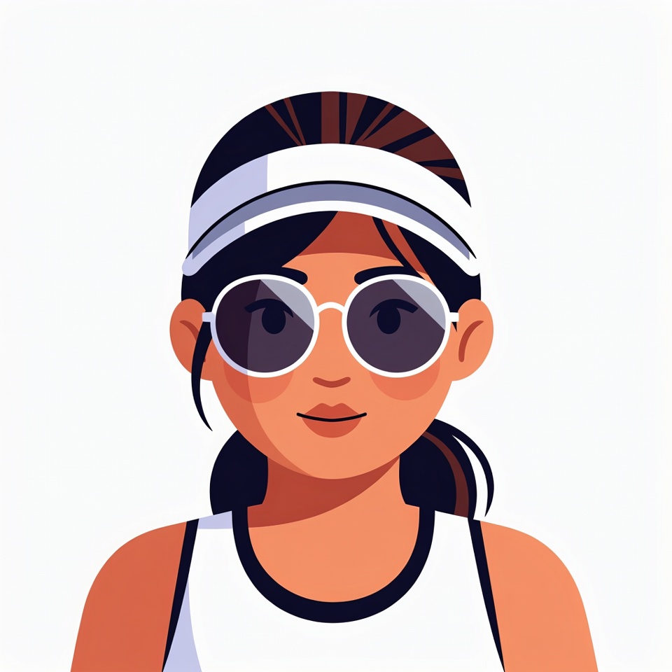 An illustrated woman with brown hair in a ponytail wears a white visor and large round sunglasses. She has a smiling expression and is dressed in a white tank top with black trim. The image features a simple isolated white background.