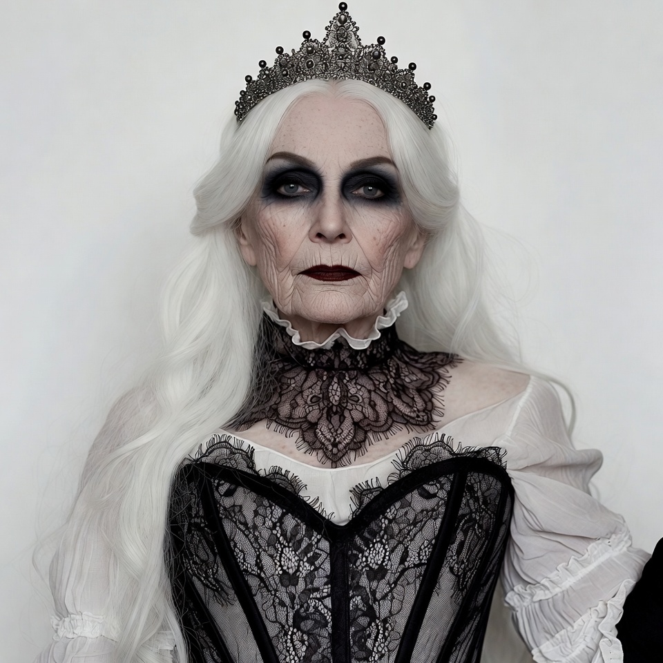 White, black crown, black lace, closeup, corset, crown, dark lipstick, dark makeup, elderly woman, goth fashion, gothic crown, halloween costume, isolated background, lace dress, long hair, pale skin, portrait, ruffled collar, sheer blouse, smokey eyes, vampire queen, white blouse, white hair, wrinkles, woman