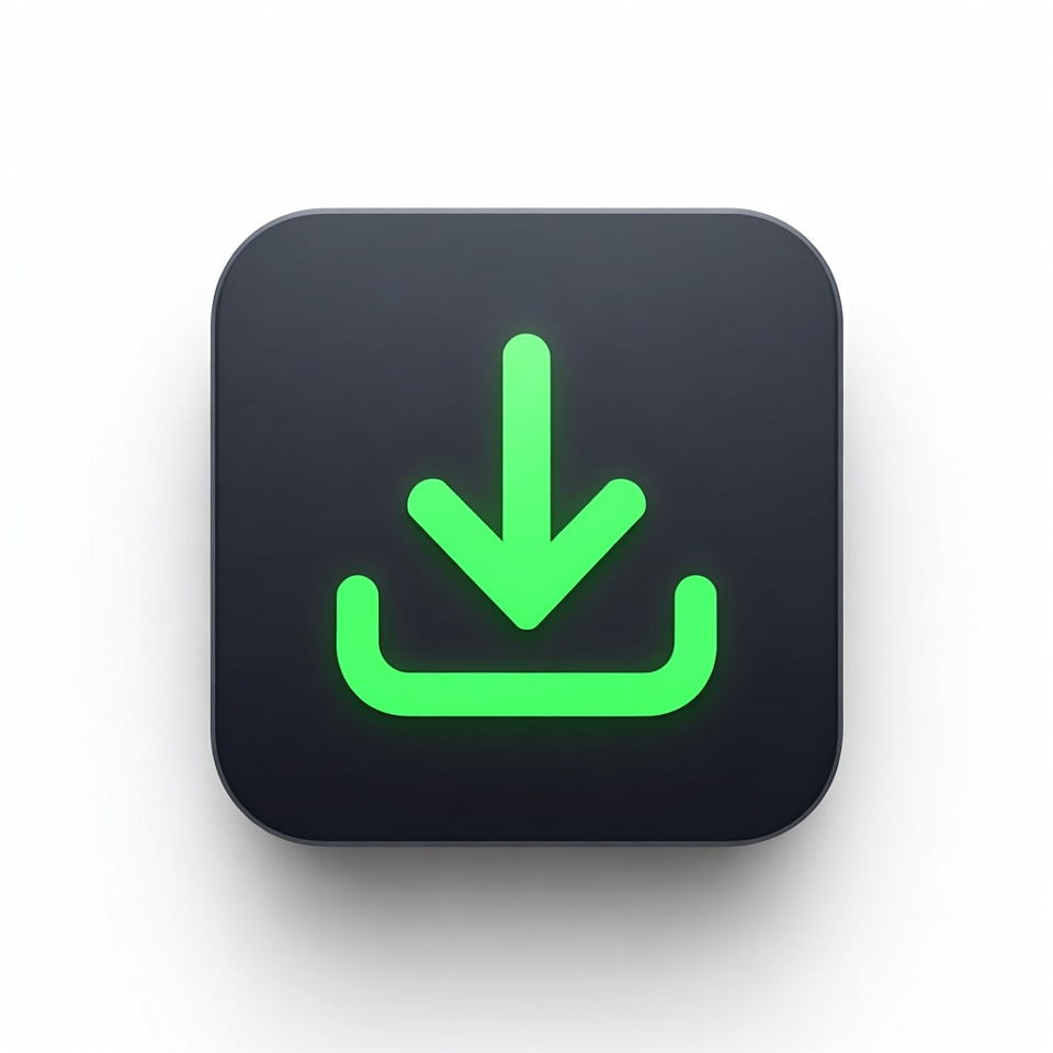 A glowing green download arrow icon sits on a dark square background. The arrow points downward with a curved base, rendered in a modern flat design style. The icon has a subtle neon glow effect.