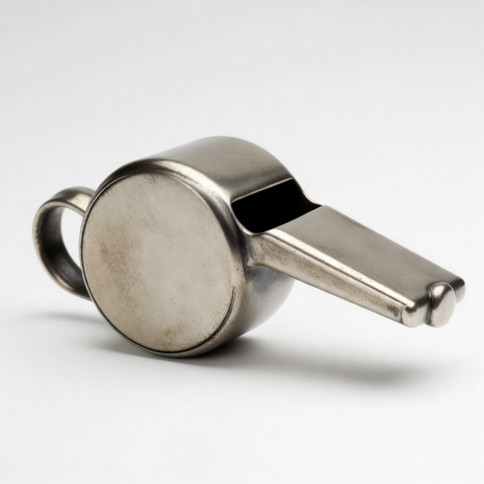 coach whistle, handle loop, isolated, metal whistle, mouthpiece, pea whistle, referee whistle, round body, shiny metal, silver whistle, sports whistle, white background, whistle