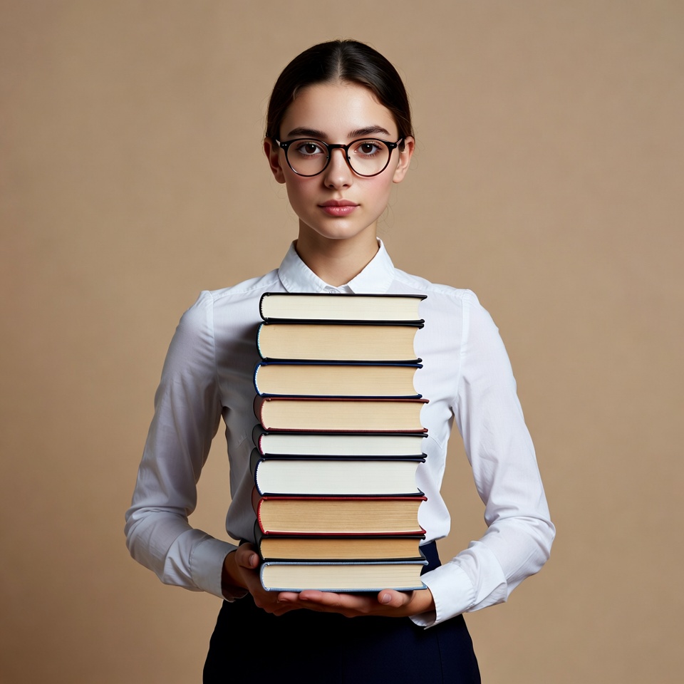 A young woman with dark hair and glasses stands holding a tall stack of hardcover books in various colors against a beige background. She wears a white collared shirt, dark skirt, and has a neutral expression. The books are pressed against her chest with both hands.