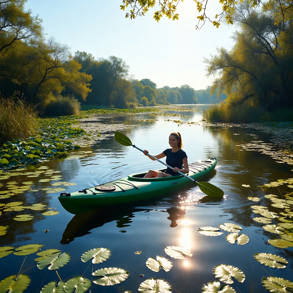 A young woman with a ponytail paddles a green kayak on a calm river surrounded by lush green trees and overhanging branches. The water is covered with large green lily pads, and sunlight reflects off the surface during a bright day. She wears a dark shirt and holds a paddle steadily.