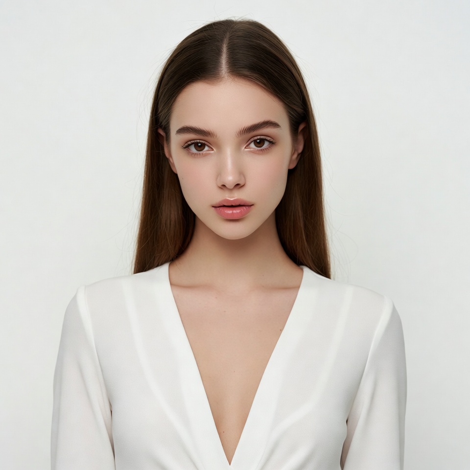 A young woman with long straight brown hair stands against a white background. She wears a white V-neck dress with a deep plunging neckline and has a neutral expression. Her face features almond-shaped eyes and full lips.
