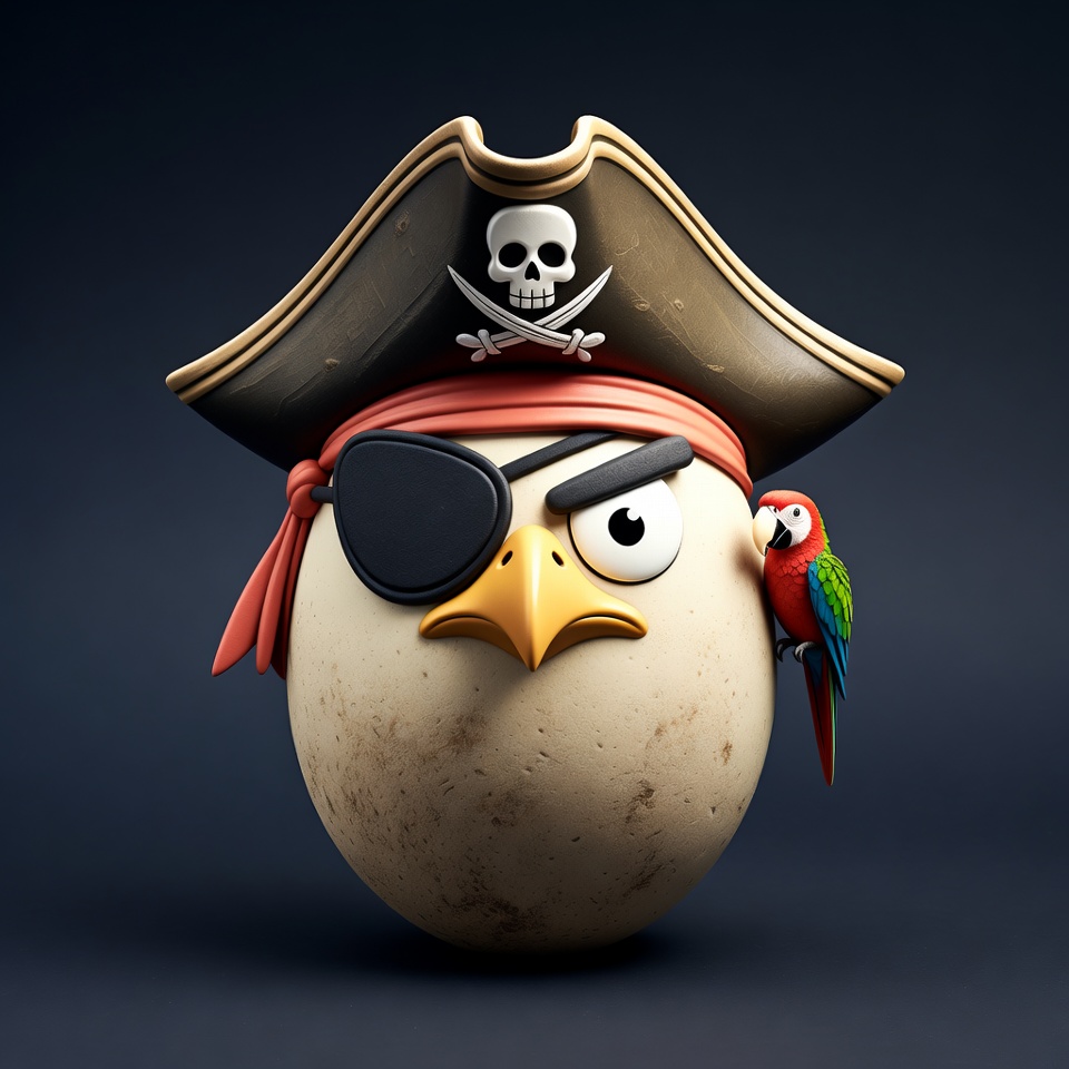 3D render, Angry Birds pirate, angry expression, bandana, bird pirate, cartoon bird, egg bird, eyepatch, green parrot, illustration, isolated background, parrot, pirate, pirate hat, red parrot, skull crossbones, tricorn hat, Angry Birds