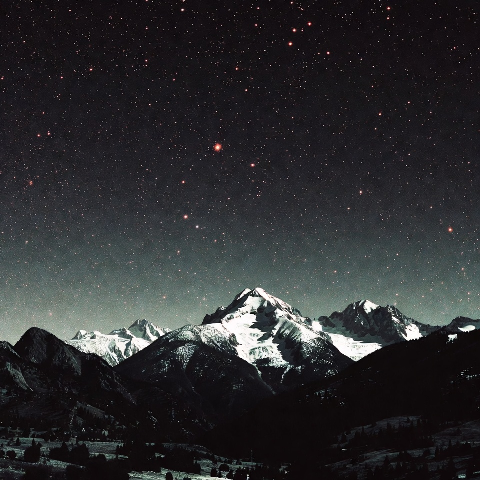Snow-capped mountains rise sharply against a dark night sky filled with numerous bright stars. The peaks are illuminated with a subtle glow, surrounded by shadowy valleys and distant trees. The scene captures a serene alpine landscape at night.
