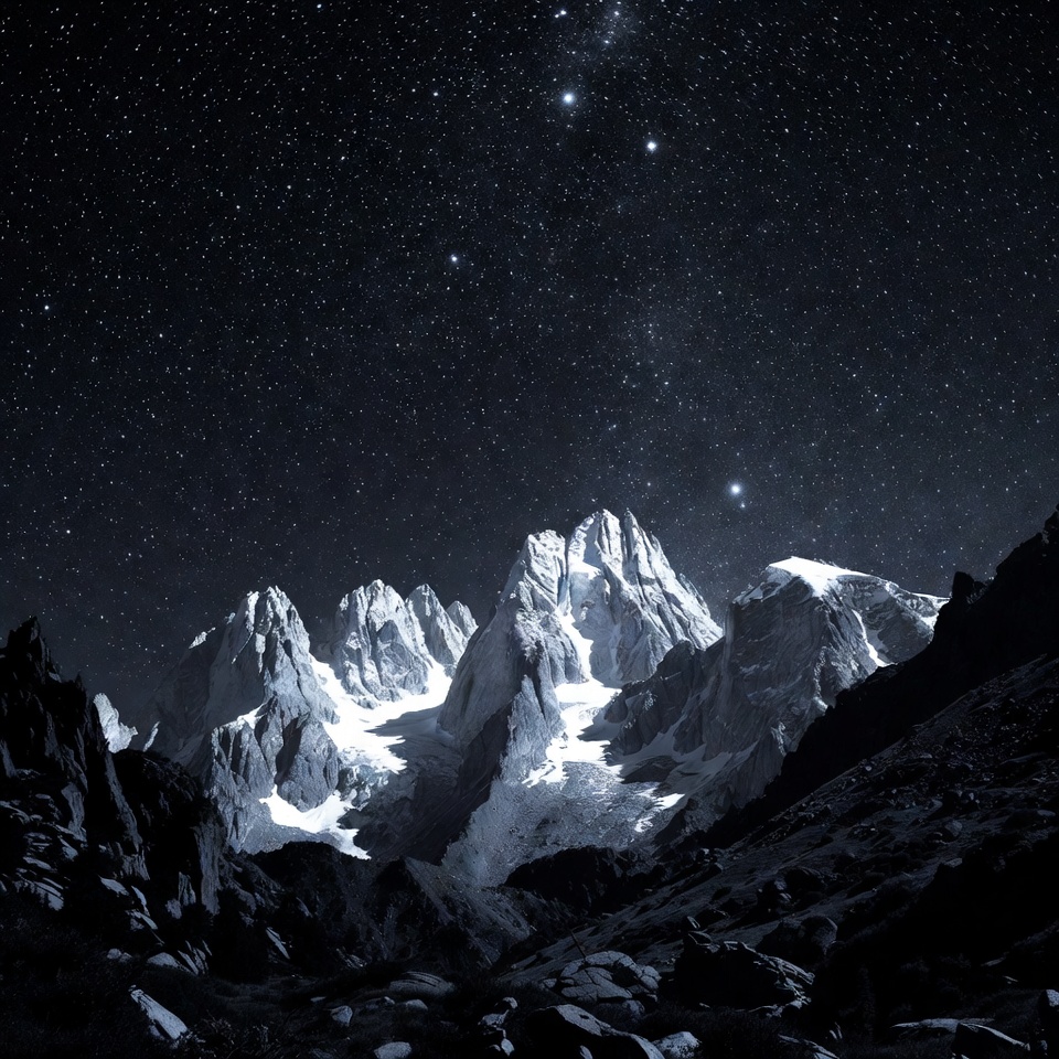 Majestic snow-capped mountain peaks rise sharply against a dark night sky filled with countless stars and the Milky Way. The rugged terrain and glaciers are illuminated by faint starlight. The scene captures a remote alpine landscape in nighttime serenity.