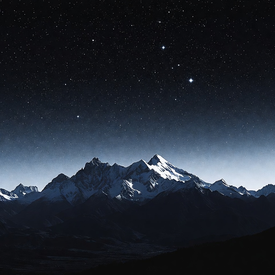 Snow-capped mountain peaks rise dramatically against a dark night sky filled with bright stars. The rugged range is illuminated by faint moonlight, creating sharp silhouettes. A vast starry expanse dominates the upper portion of the image.