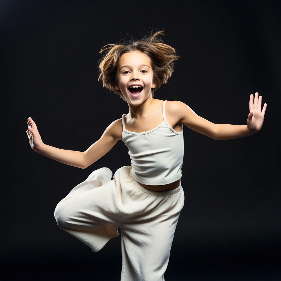White, arms outstretched, black background, brown hair, camisole top, child, dancing, energetic pose, excited, female, flying hair, happy face, joyful, jumping, kid, motion, open mouth, white outfit, wide pants, young girl, girl