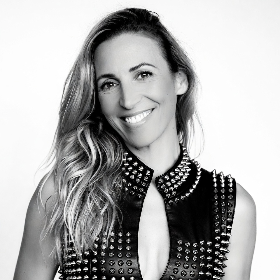A woman with wavy blonde hair smiles at the camera in a black and white portrait. She wears a black leather vest adorned with silver studs around the collar and neckline. The image features an isolated white background.