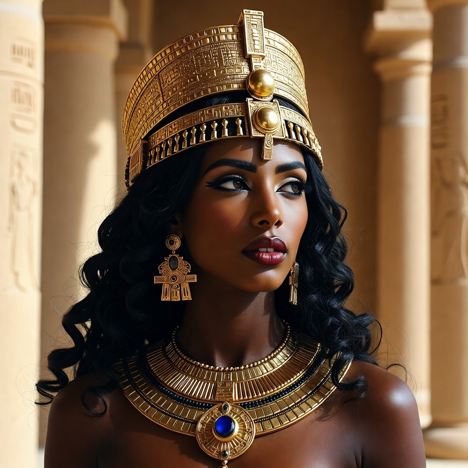 A beautiful African woman with dark skin and long wavy black hair wears an elaborate golden Egyptian headdress and large hoop earrings. She has striking kohl-lined eyes, full red lips, and a wide gold necklace with blue gemstones around her neck. She stands topless in front of ancient beige stone columns.