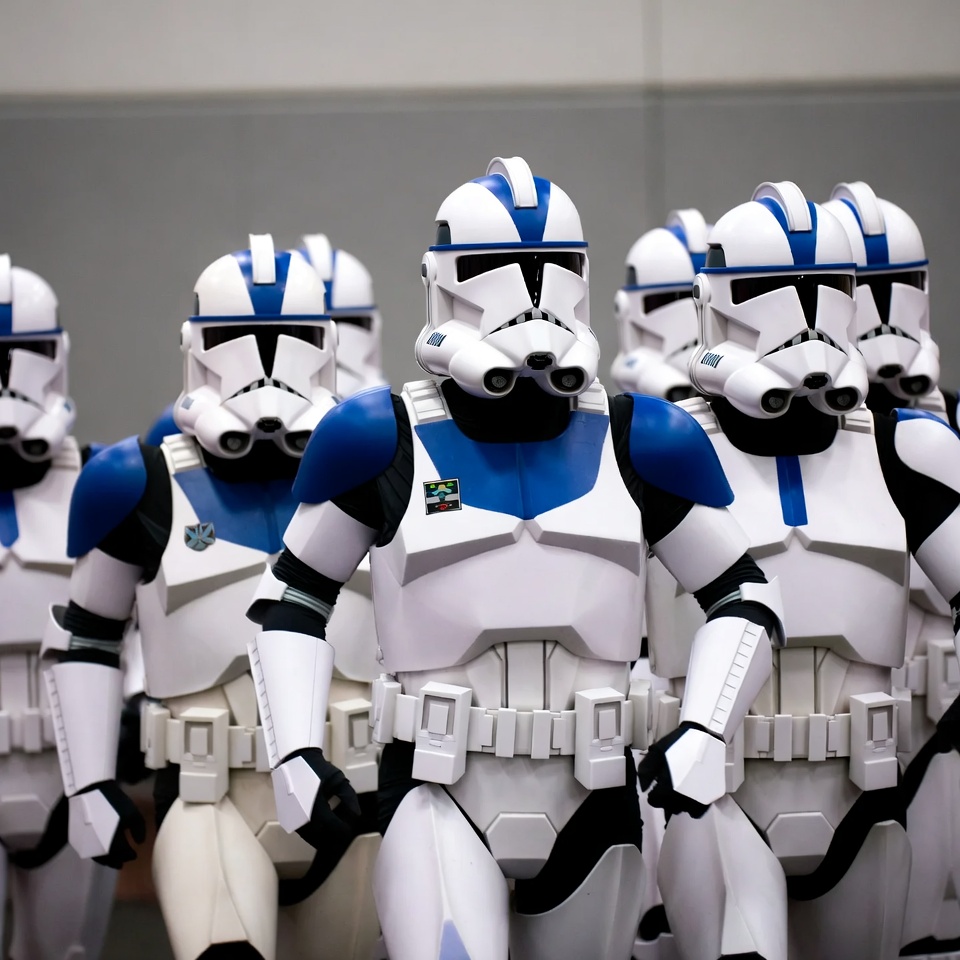 Star Wars, action figures, blasters, blue markings, clone troopers, clones, cosplay, formation, futuristic, gray background, group, helmets, military, phase II armor, sci-fi, soldiers, standing, stormtroopers, white armor, ARC troopers