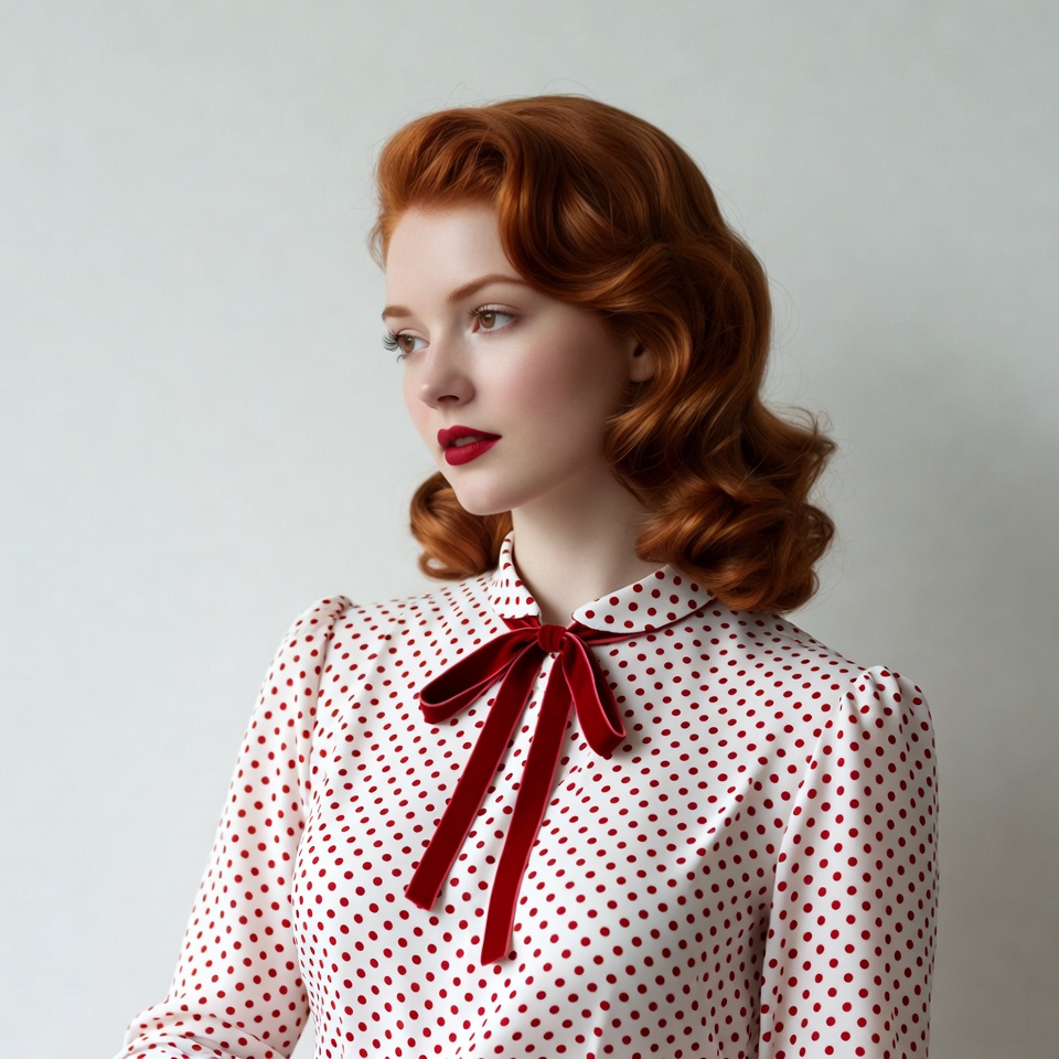 A young woman with vibrant red vintage-style wavy hair turns her head slightly to the side against a plain white background. She wears bold red lipstick and a white polka dot blouse with puffed sleeves and a large red bow tie at the collar. Her fair skin and light eyes are highlighted in the close-up portrait.