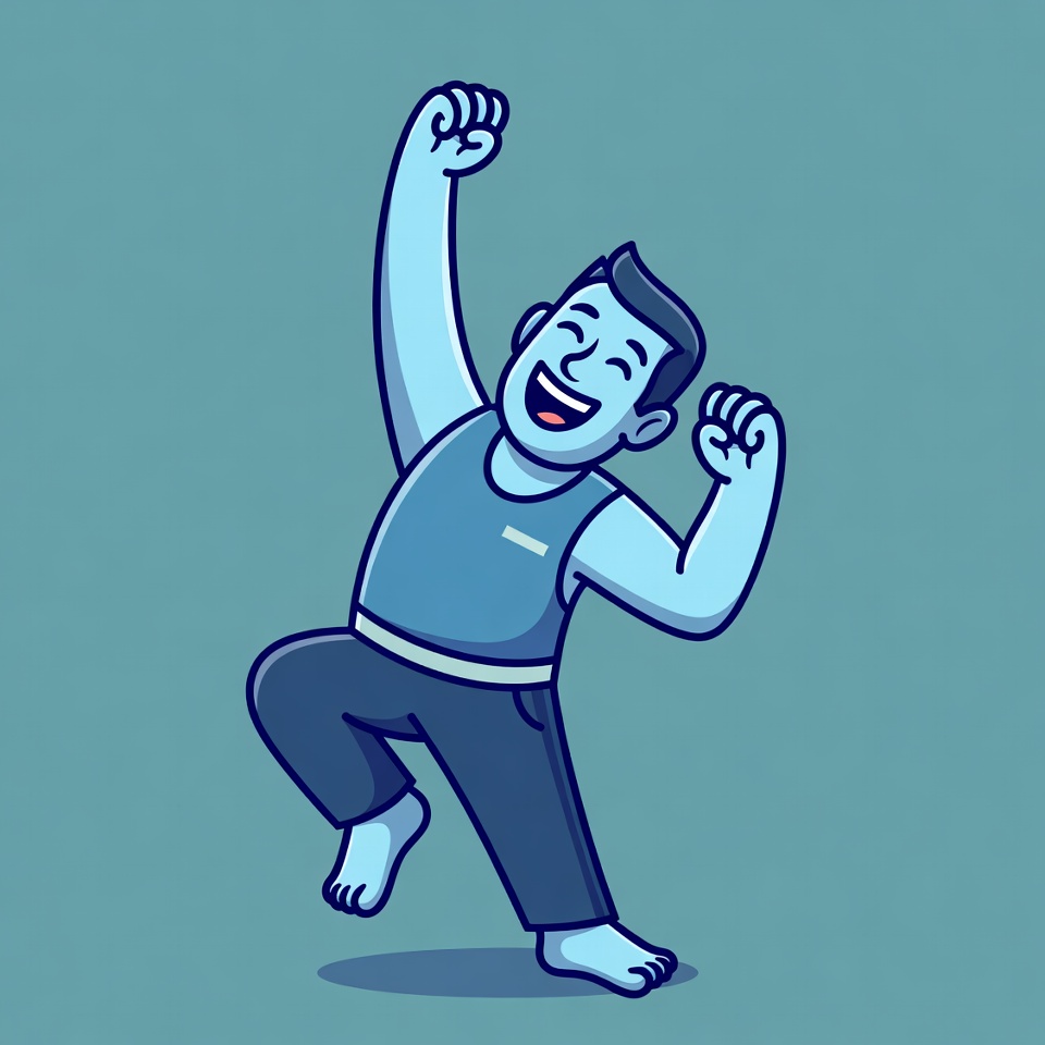 A blue cartoon illustration of a muscular man with short dark hair joyfully raises both arms high in celebration. He wears a sleeveless tank top and pants, standing barefoot with one leg lifted on a solid teal background. His face shows a wide smile and squinted eyes expressing excitement.