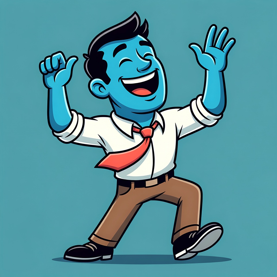 A blue-skinned cartoon man with short black hair smiles widely and laughs while raising both hands triumphantly. He wears a white dress shirt, red tie, brown pants, and black shoes. The illustration features him on a solid blue background.