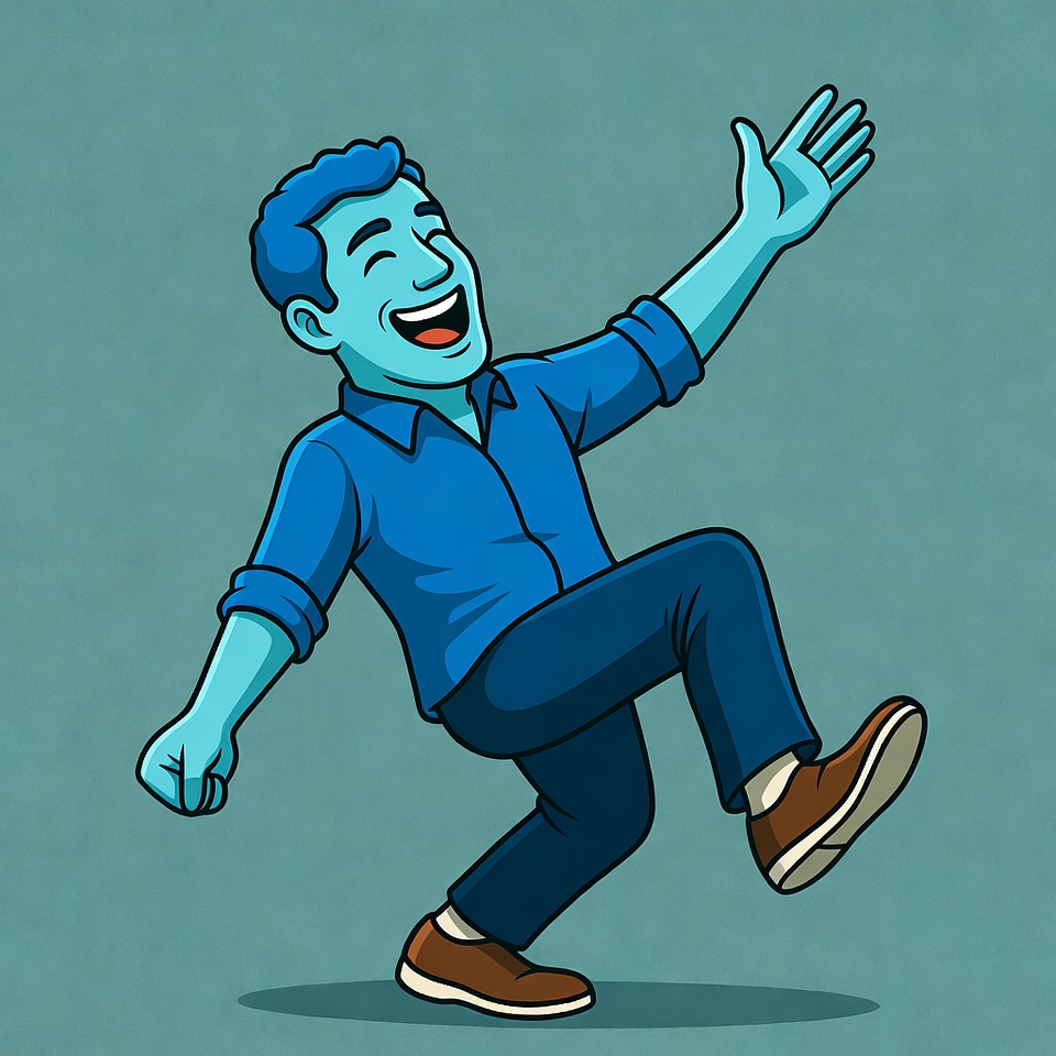 A cartoon illustration of a blue-skinned man dancing energetically with one arm raised and leg lifted. He wears a blue collared shirt with rolled sleeves, blue pants, and brown shoes. The figure stands against a solid teal background.