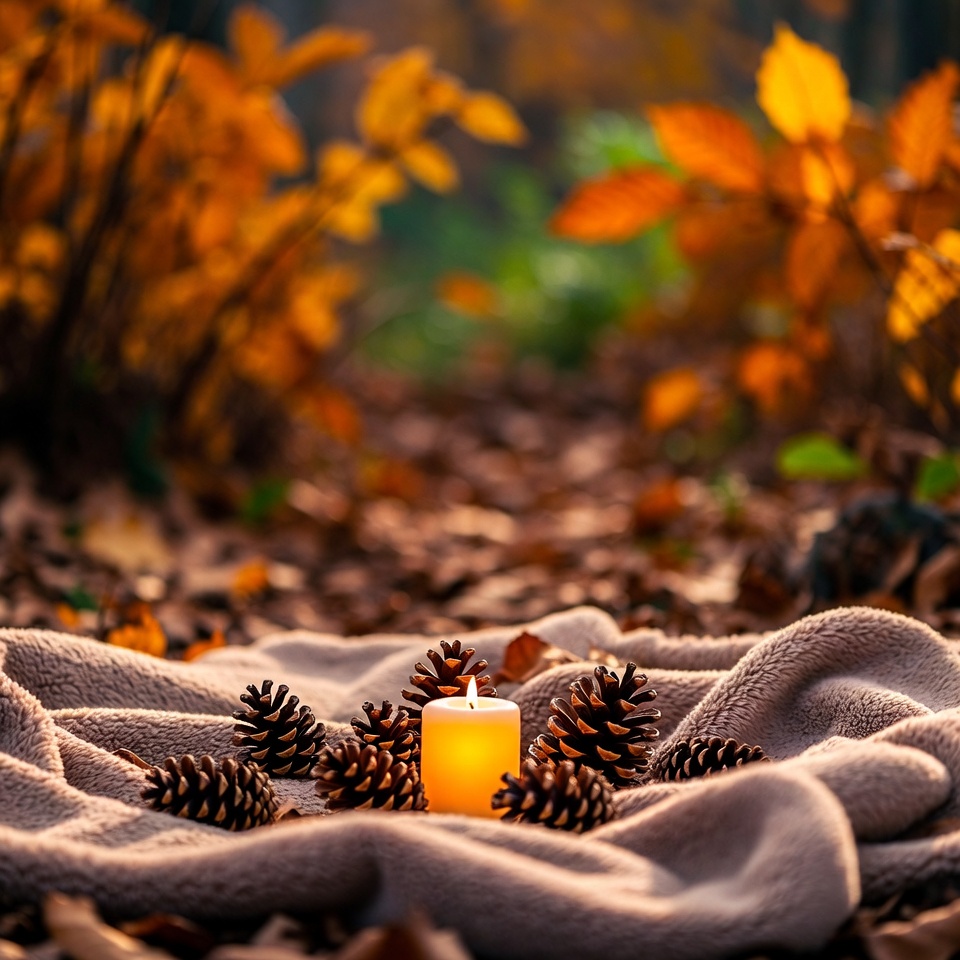 autumn, beige blanket, blanket, bokeh background, cozy, earthy tones, fall leaves, foliage, forest floor, holiday decor, lit candle, nature, orange leaves, outdoor, path, pine cones, rustic, seasonal, single candle, thanksgiving, warm glow, woods, yellow leaves, candle