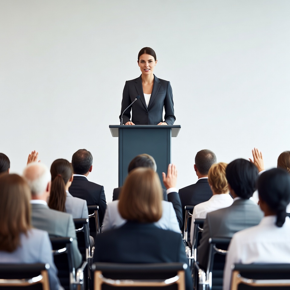 A woman in a dark business suit stands at a podium delivering a speech. She faces a diverse audience of men and women seated in chairs, many raising their hands. The setting features a plain white background with a microphone on the podium.