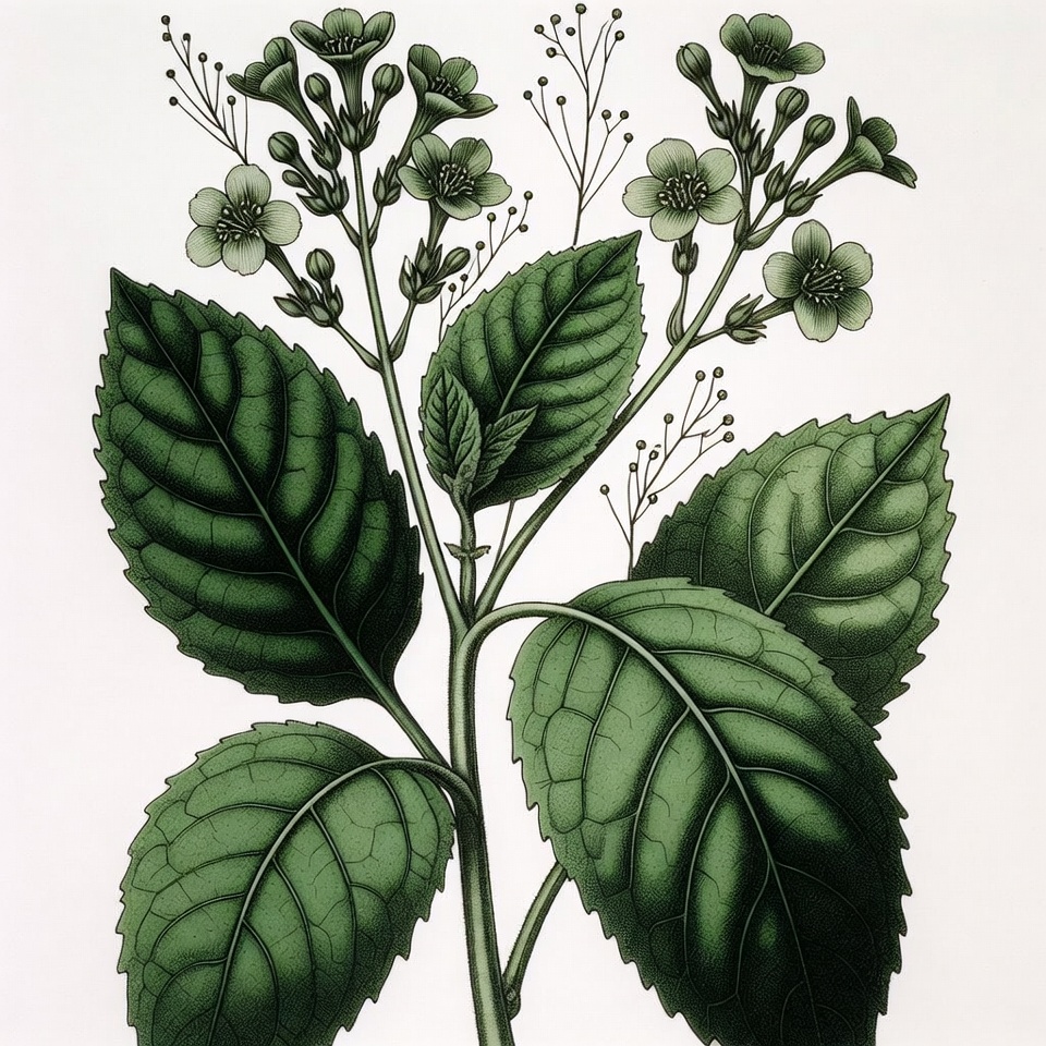 A detailed botanical illustration depicts a green plant with serrated leaves and clusters of small white flowers. The flowers feature tiny green centers and delicate petals on slender stems. The plant is shown against an isolated white background.