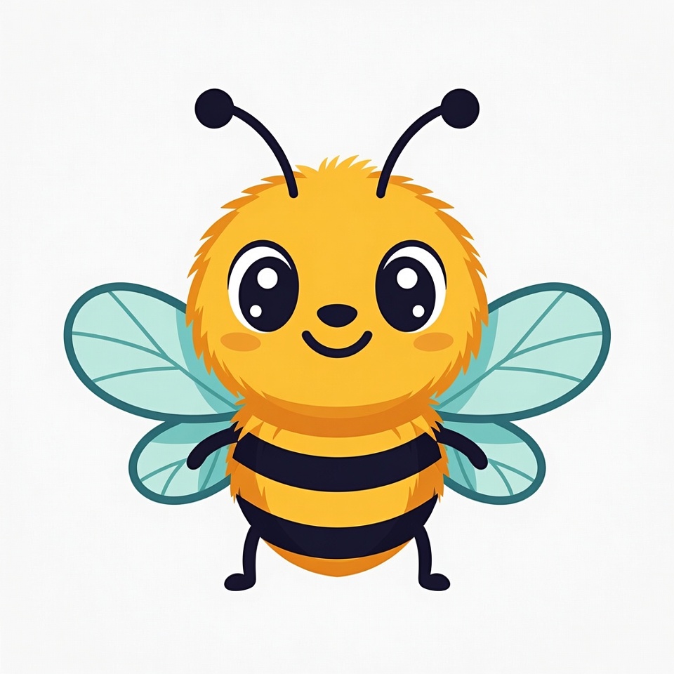 A fluffy yellow cartoon bee with black stripes stands on a white background. It has large sparkling eyes, a smiling mouth, and transparent blue wings. The bee features fuzzy texture and antennae.